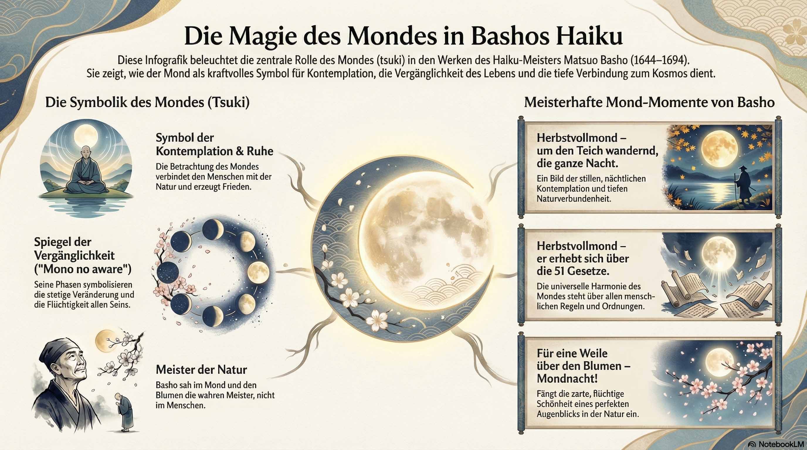 Bashō besuchte die Ruinen von Hiraizumi, einst eine prächtige Samurai-Stadt, die in den Kriegen der Vergangenheit zerstört wurde. Statt blühender Burgen und stolzer Krieger sieht er nur Sommergras – das ist alles, was von den hochfliegenden und siegesgewissen Träumen der Krieger geblieben ist.