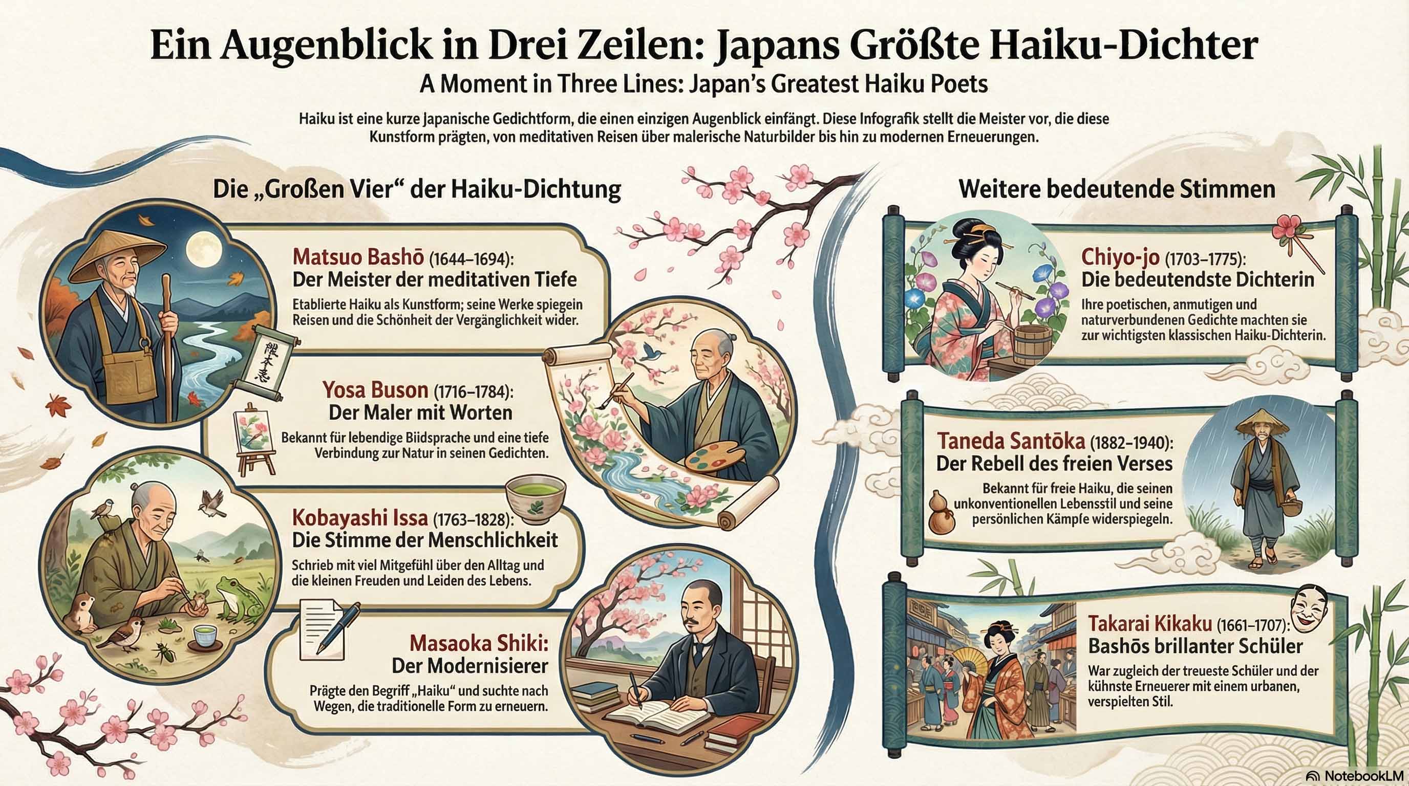 Bashō, Buson, Issa und Shiki werden als die »Großen Vier« der Haiku-Dichtung bezeichnet. Jeder brachte einen eigenen Ton mit: Bashō die meditative Tiefe, Buson die malerische Bildsprache, Issa die Menschlichkeit und Shiki den modernen Blick.